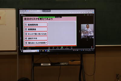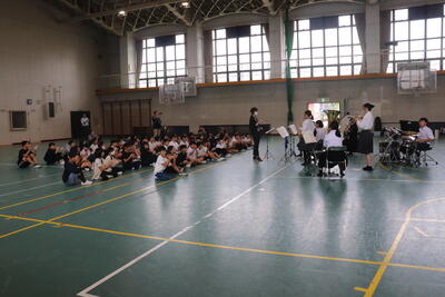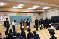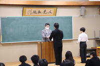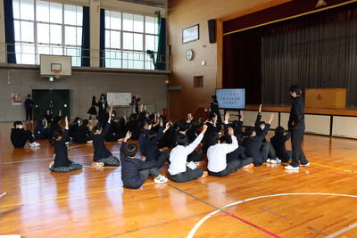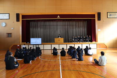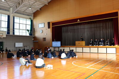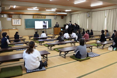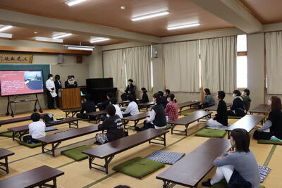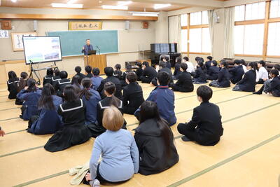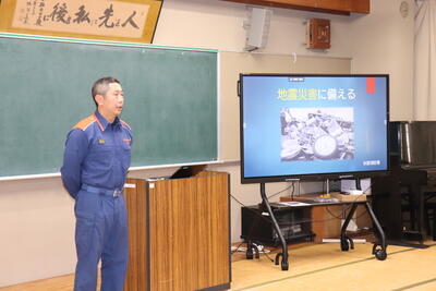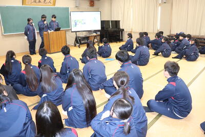 最初にシェイクアウト訓練を行ったあと、生徒会のメンバーによる伊吹山視察の報告があり、その後、消防署の方からの防災講話をいただきました。