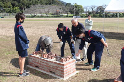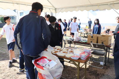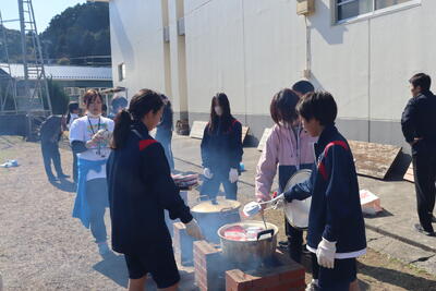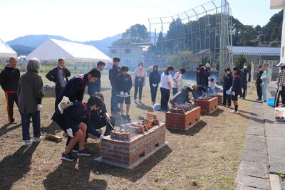 1、3年生は、かまどベンチを使用して火をおこし、カレー、豚汁、焼き芋の非常食体験を行いました。